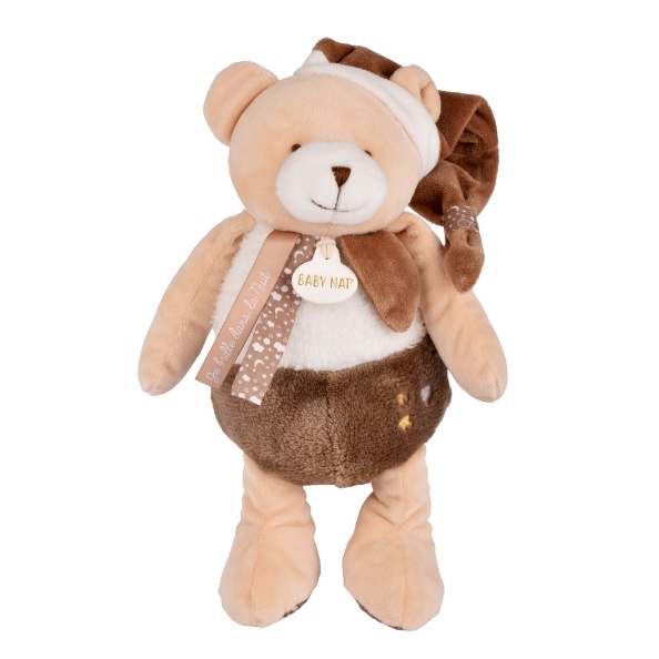 Avec sa belle rondeur et son adorable bonnet de nuit, l’ours Lumibrille veille tendrement sur les tout-petits.